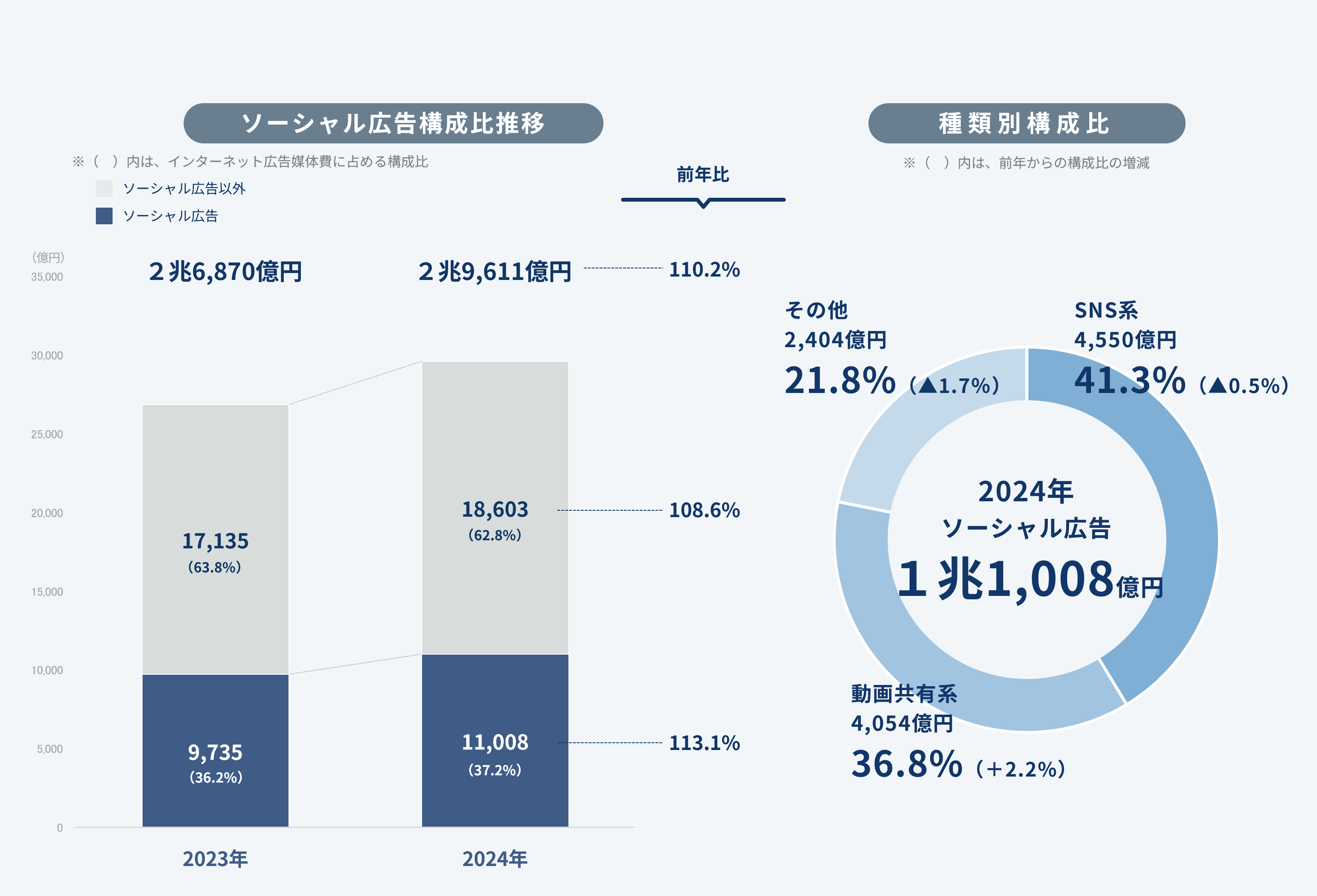 ソーシャルメディアのサービス上で展開されるソーシャル広告は、前年比113.1%の1兆1,008億円となり、2019年の推定開始以降はじめて1兆円を超えた。インターネット広告媒体費に占める構成比は37.2%となった。