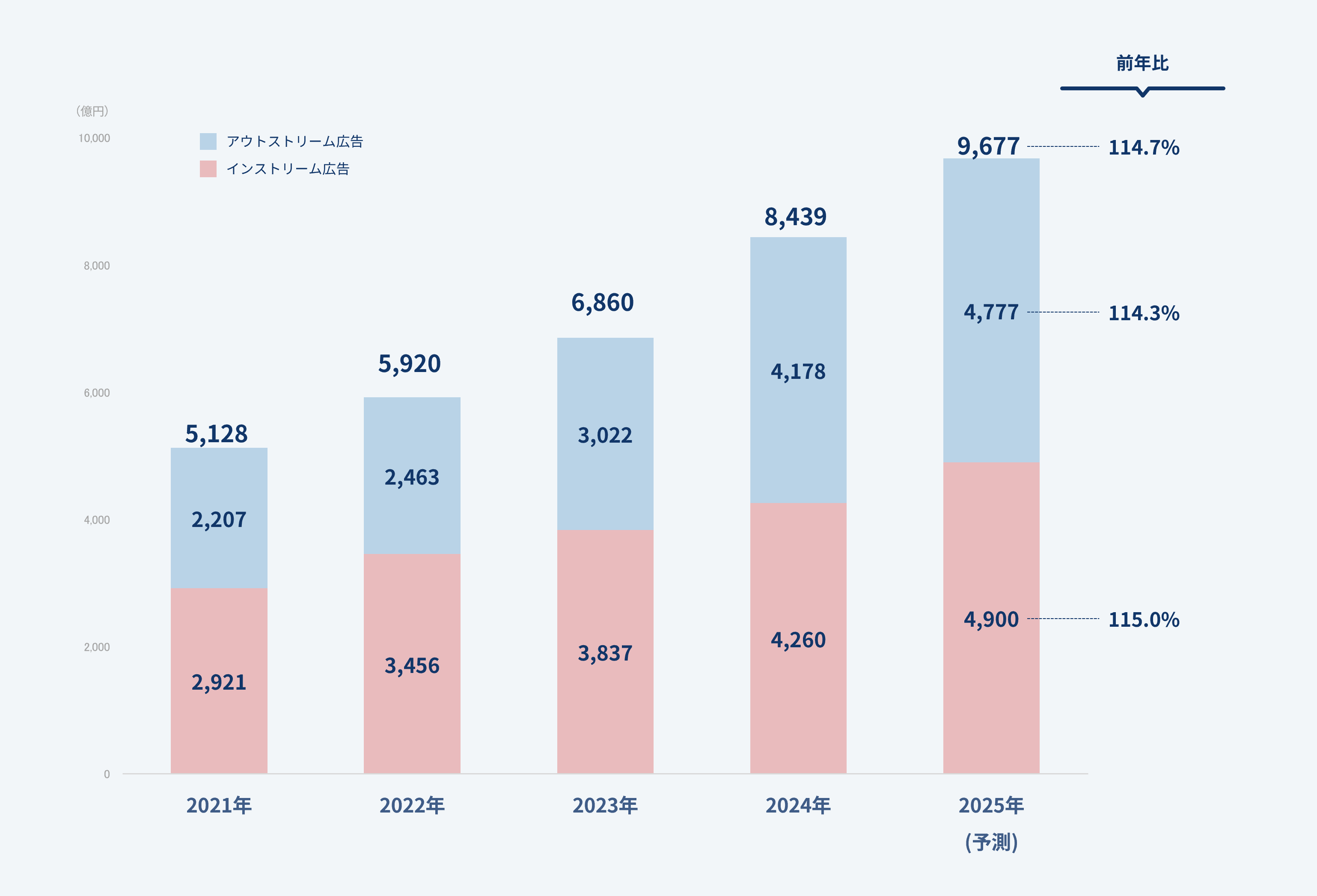 2025年のビデオ(動画)広告は、2025年も二桁成長を維持し、前年比114.7%の9,677億円になると予測する。アウトストリーム広告とインストリーム広告はほぼ同等の成長を見込む。