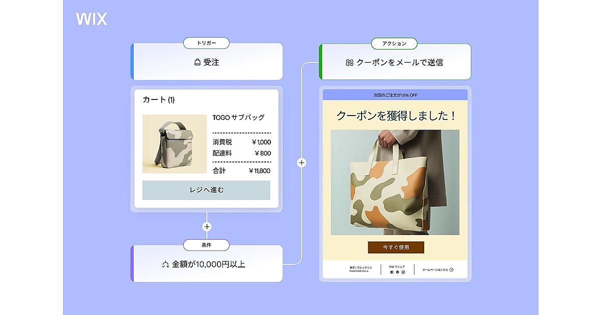 メールの自動化機能では顧客別の利用状況やメール受信時のアクションの詳細なパフォーマンスデータで効果的にコミュニケーション戦略を最適化できる。Wixの各種サービスと統合されているので、購入頻度や過去の購入金額合計からリピーター顧客にクーポンを発行したり、決済時の購入金額に応じて金額が変化する割引クーポンを送付したりできる。