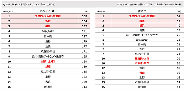 この調査によると「働きたい街」は、オフィスワーカー・就活生ともに「丸の内・大手町・有楽町」「新宿」「横浜」がトップ3となった。