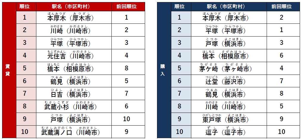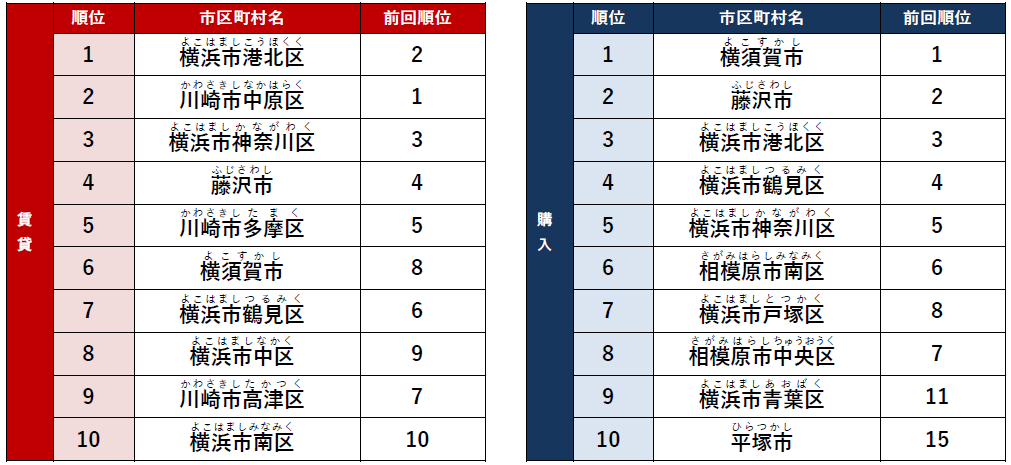 神奈川県は、賃貸1位が前年1位「川崎市中原区」から「横浜市港北区」に入れ替わり。新横浜駅を中心にマンションなどの新興住宅地が広がっている。一方購入は前年と同じく、米軍基地を擁する「横須賀市」が1位だった。