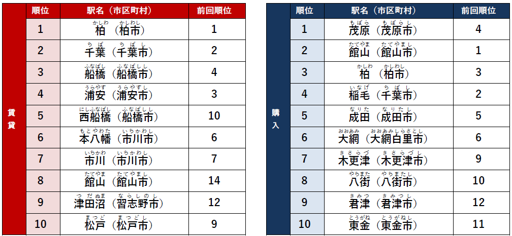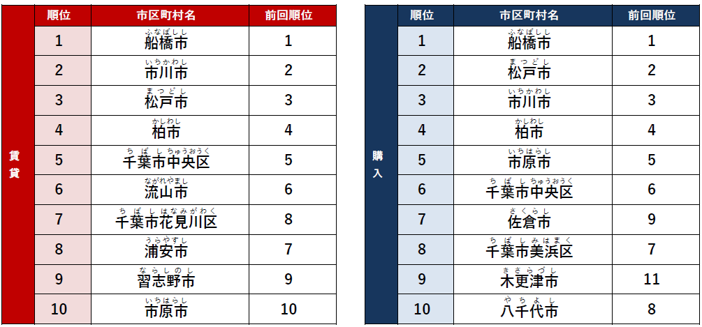 千葉県は、賃貸・購入ともに「船橋市」が1位。千葉市に次いで人口第2位の都市で、JR総武本線や京成本線など多くの路線が乗り入れており、東京都心への通勤・通学者が多い。