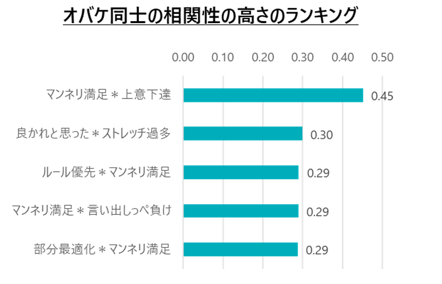 また「課題同士の相関性」を見ると、「マンネリ満足×上意下達」の相関が0.45と他に比べて特に高かった。マンネリ満足と上意下達が共存すると、上位層の考えに無批判で従うケースが増えると考えられる。そのほかでは「良かれと思った×ストレッチ過多」だと、組織方針や顧客要望を過剰に受け入れ、チームが疲弊していく構図が生まれるだろう。