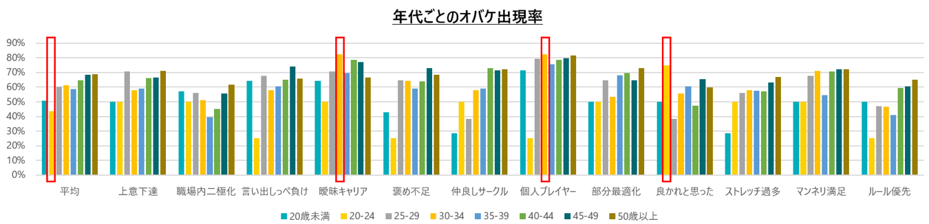 「年代別の課題の出現率」を見ると、少ない年代は「20~24歳」、多い年代は「45~49歳・50歳以上」だった。20~24歳の若年層は、上司以外の関係者との接点が比較的少なく、また視野や経験も不十分のため、課題確認が少ないと思われる。ただしこの世代は「良かれと思った」の出現率が高く、自分の許容範囲を見誤り非現実的な量や内容の要件を受け入れてしまう可能性が考えられる。