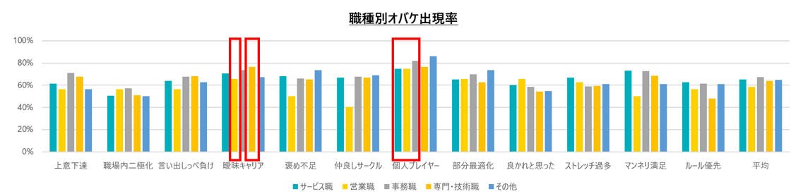 さらに「職種別の課題の出現率」を見ると、サービス職・営業職・事務職では「個人プレイヤー」が多く、専門・技術職では「曖昧キャリア」が多かった。専門・技術職はキャリアの選択肢を広げることが難しく、「専門性をさらに高める」以外の道を考えにくいことが要因の1つとして考えられる。