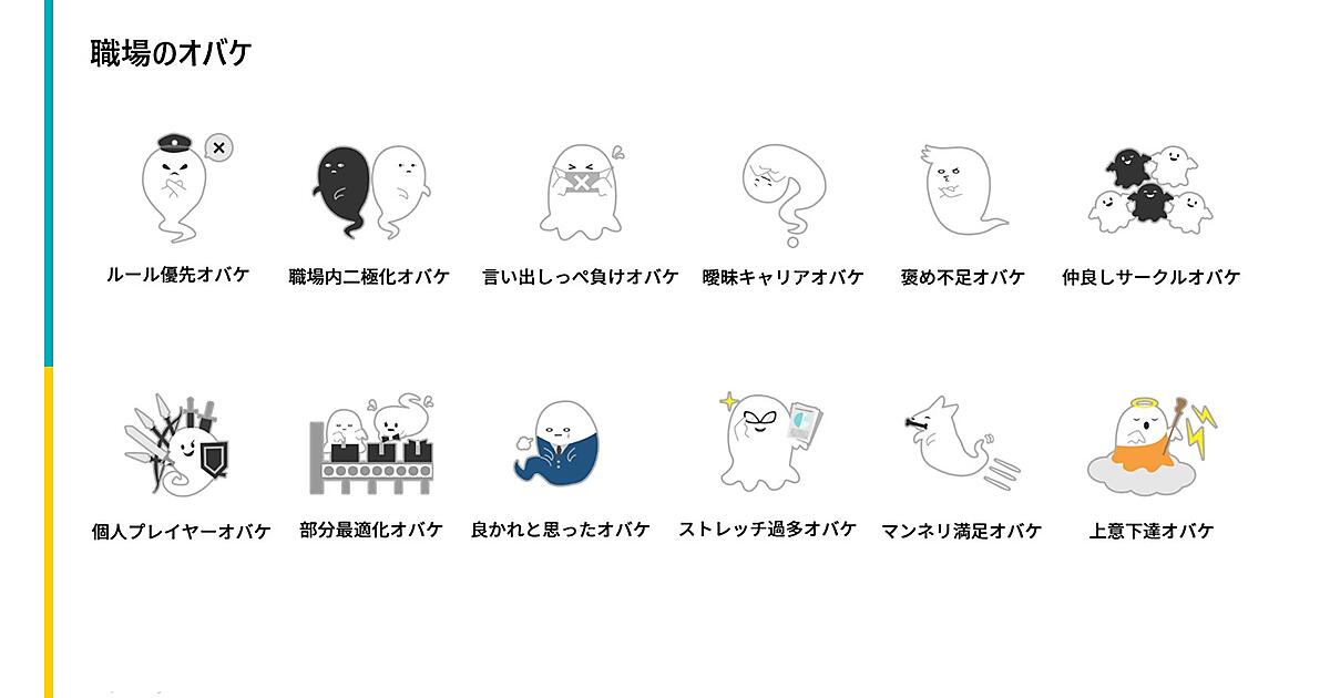 『職場のオバケ探し』は、組織やチームに潜んでいる“目には見えない課題”“課題を抱えた人物”を「職場のオバケ」に見立て、チームメンバーで探索し、退治方法(=課題の解決策)などについて対話を重ねるためのツール。12種類の組織の課題が設定されている。