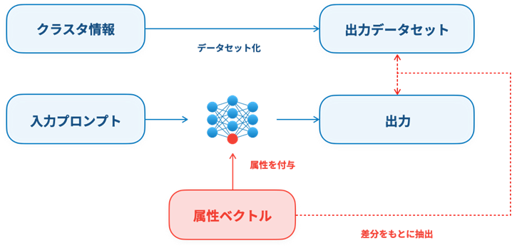 この技術は、バイアスの影響を抑えるよう学習したパラメータ(属性ベクトル)でユーザーモデルを生成するなどしてバイアスを取り除く。企業固有の匿名化したデータをさらに多段階のクラスタリング(集団化)で統計化した情報から出力データセットを生成し、属性ベクトルの抽出に利用。LLMに属性ベクトルを加えるため性格、価値観など多様な属性が付与できる。