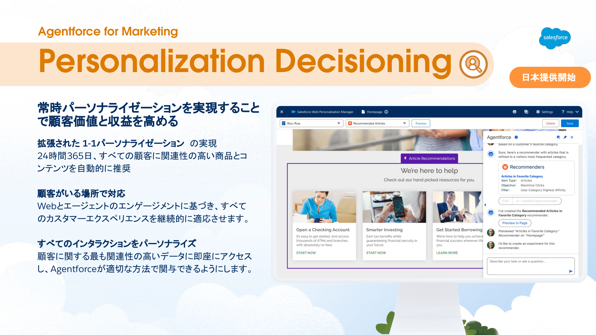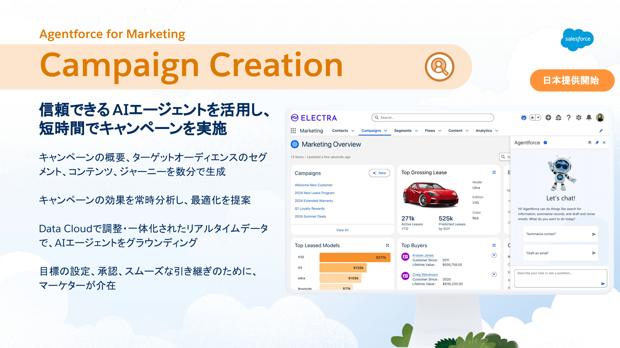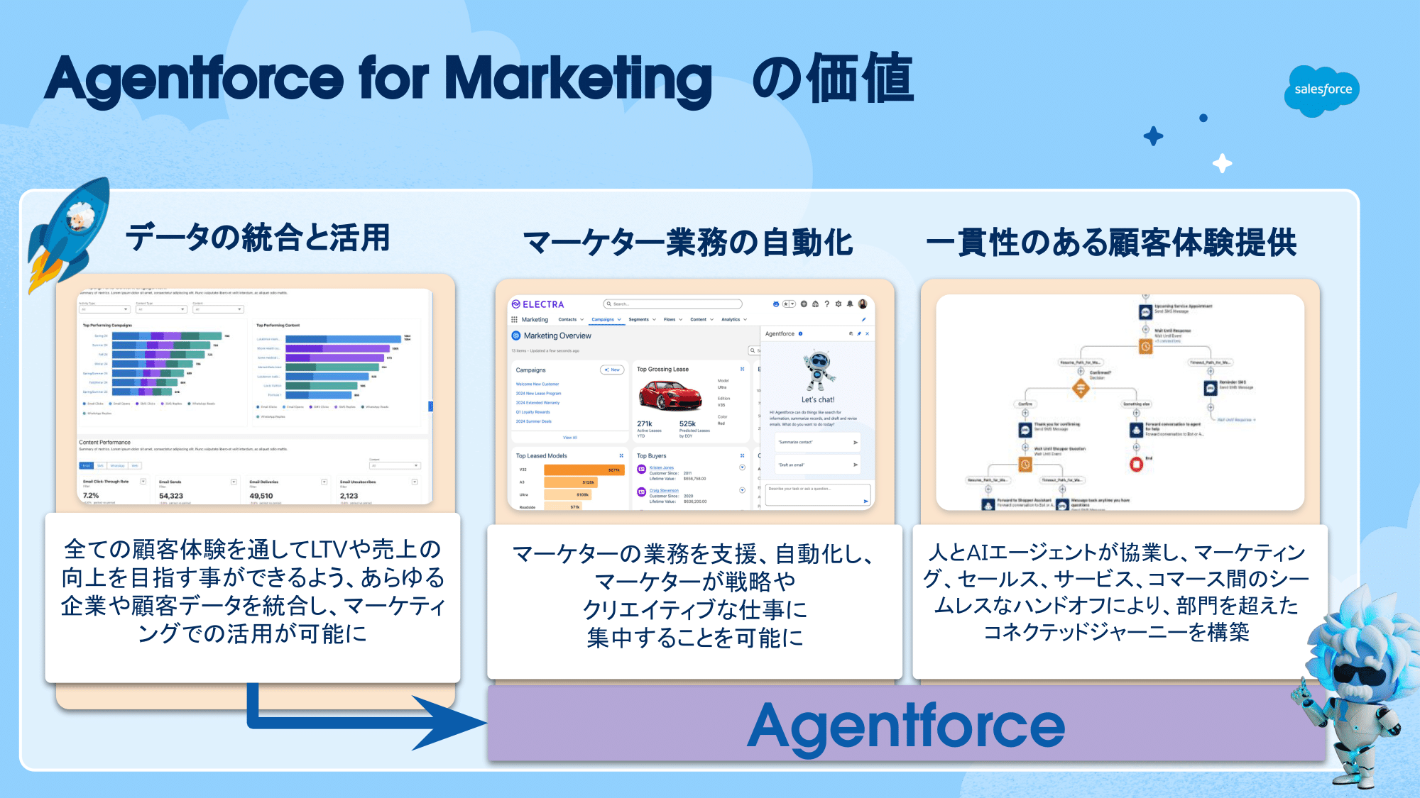 セールスフォース・ジャパンは自律型AI(人工知能)エージェントを活用した「Agentforce for Marketing」を日本市場で提供を始めたと3月25日に発表した。マーケティング担当者は統合されたプラットフォーム上で顧客データを一元管理でき、AIエージェントを活用したキャンペーン作成や、よりパーソナライズされた顧客体験を提供できる。