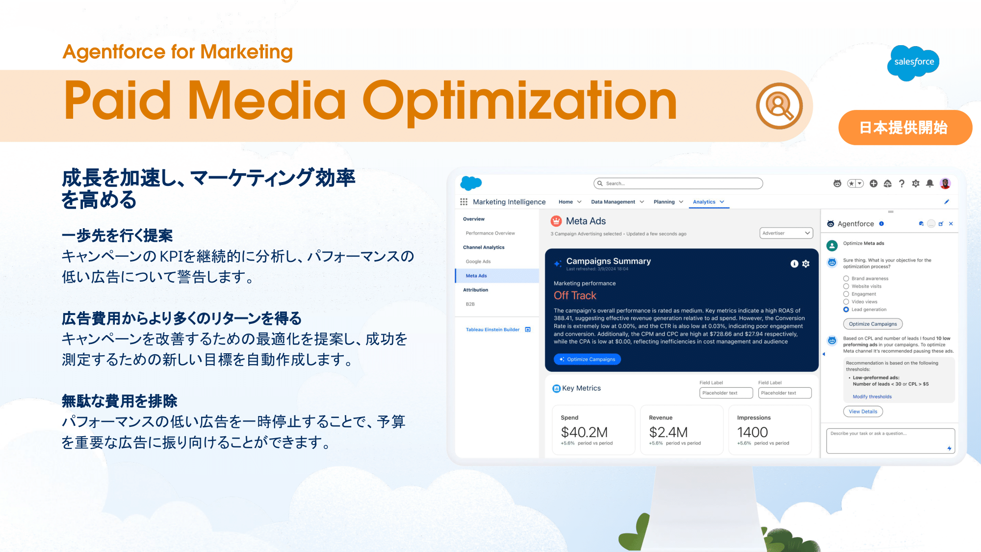 ③はパフォーマンスの低い広告を自動的に特定して一時停止し、最適化を提案する。自動作成された目標で指標を調整し、担当者がより効果的にペイドメディアを最適化できるよう支援する。日本での円滑な導入をケイズコーポレーション、Surpass、テラスカイ、toBeマーケティング、ビズブーストなどのパートナー企業と協力して展開する。