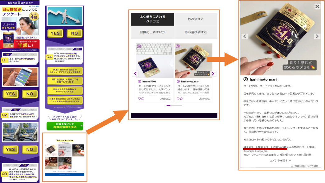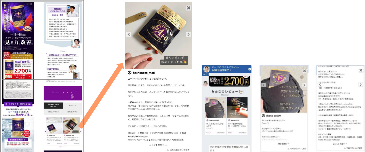 2023年9月30日から24年7月29日まで、Instagramの画像をクリックしても投稿本文が非表示設定で「#PR」「#ロート製薬」など関係性を明示する表現を確認できなかった。ロート製薬によると、23年10月施行の景表法改正に合わせて投稿者へ「#PR」や「#企業名」などの表記を付与するよう依頼し、9件の広告は画像クリックで投稿本文を表示する設定だったが、1件の広告で誤って非表示の設定だったことを見落としていた。