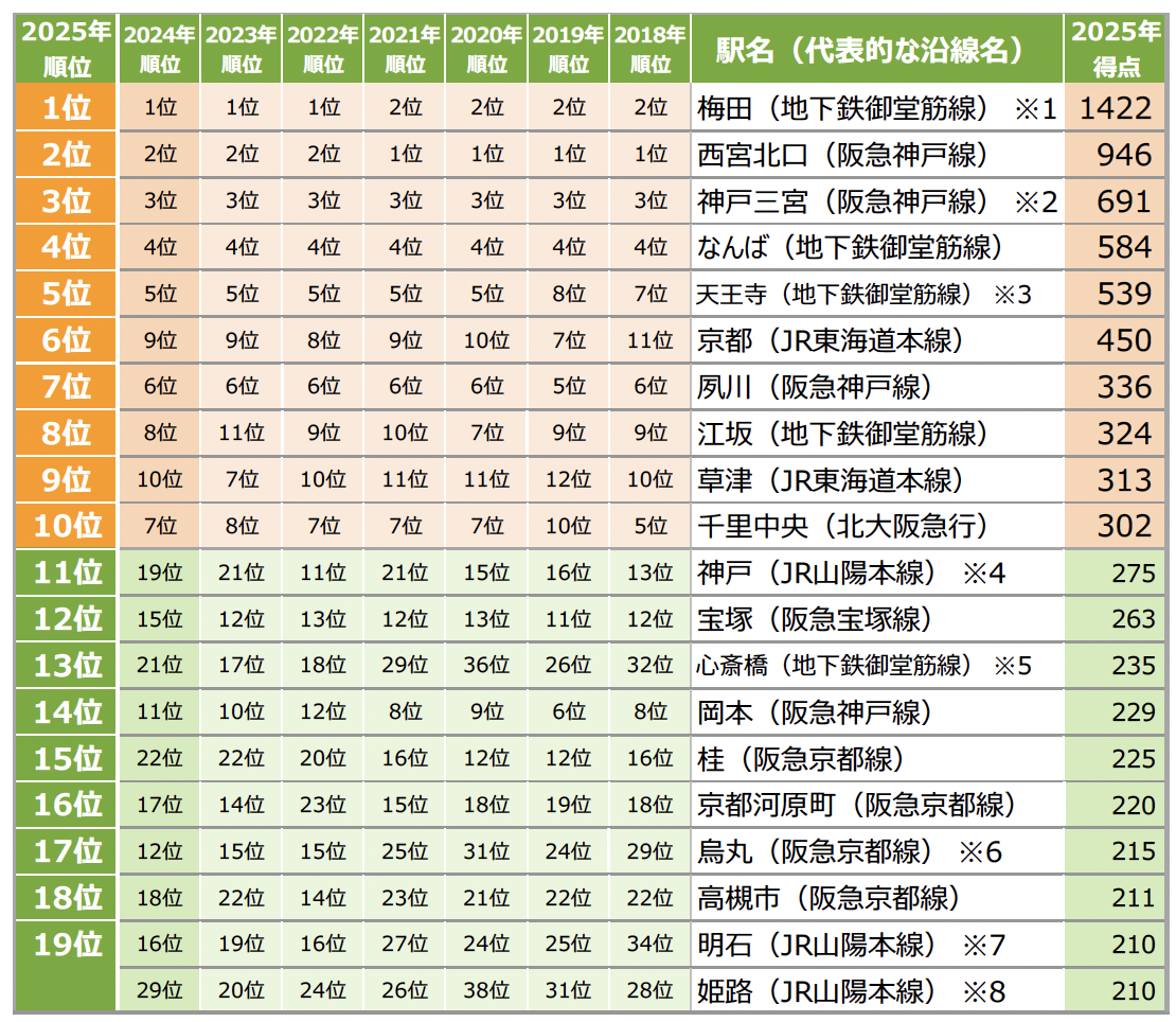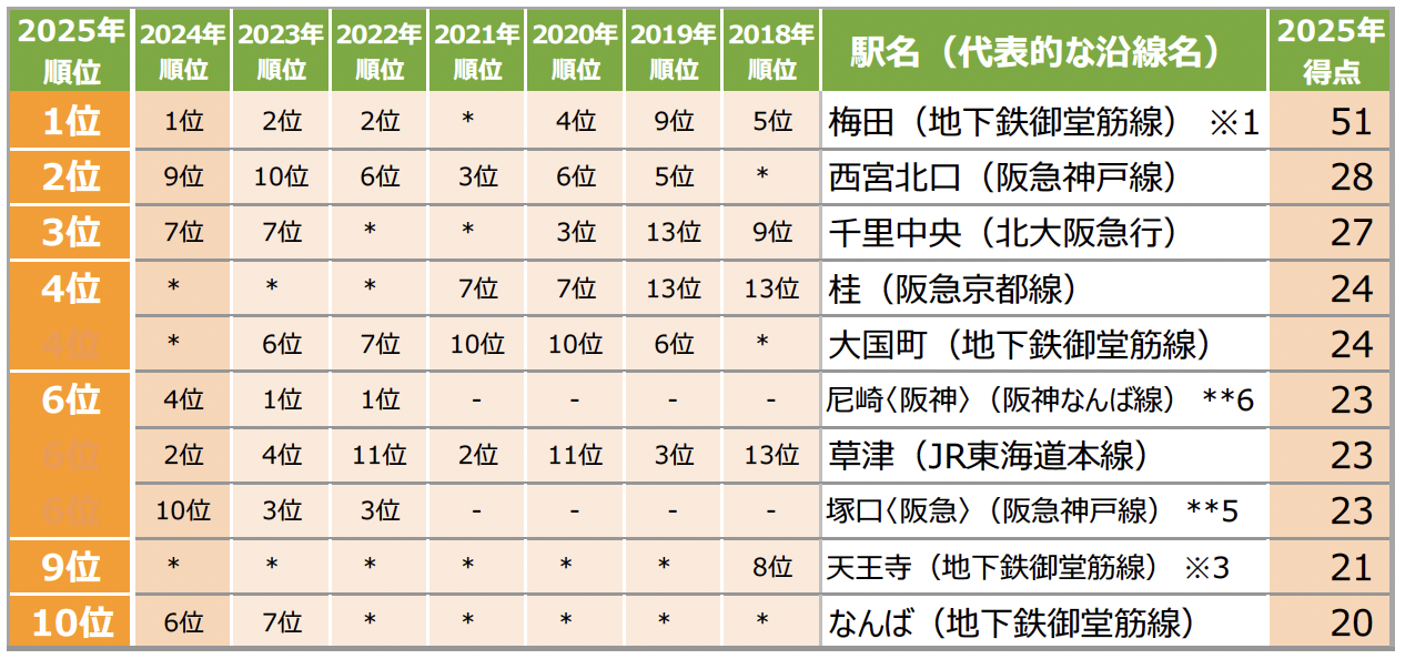 関西の2025年の住みたい街(駅)ランキング1位は、2022年から連続で「梅田」となった。2位は「西宮北口」、3位は「神戸三宮」、4位は「なんば」、5位は「天王寺」だった。