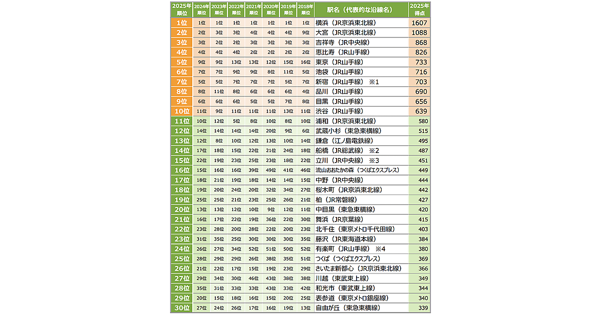 首都圏の2025年の住みたい街(駅)ランキング1位は、2018年から連続で「横浜」となった。2位は「大宮」、3位は「吉祥寺」、4位は「恵比寿」、5位は昨年9位からのアップした「東京」だった。