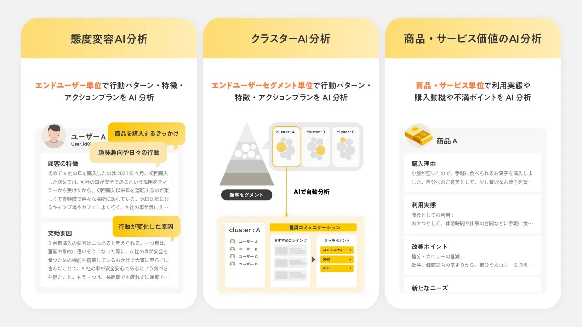 3つのAIエージェント機能があり、「態度変容AI分析」は会員や購買、コミュニティなど複数のデータソースを顧客単位で統合して行動パターンや特徴、アクションプランを自動分析する。「クラスターAI分析」は複数の顧客をまとめて行動パターン、購買傾向、アクションプランを自動生成する。「商品・サービス価値のAI分析」は口コミやレビュー、SNS、アンケートから利用実態・購入動機・不満ポイントのレポートを生成する。