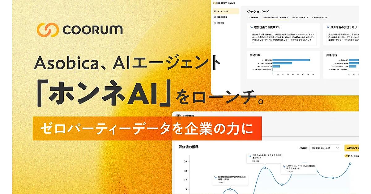 顧客データプラットフォーム「coorum(コーラム)」シリーズを展開するAsobicaは、AI(人工知能)エージェント「ホンネAI」の提供を始めたと3月25日に発表した。企業が保有する購買・アプリデータと、オンラインコミュニティツール「coorum community」やリサーチツール「coorum research」で得られるゼロパーティーデータ(顧客が自ら提供するデータ)を統合して顧客の行動変化や傾向を分析・可視化することができる。