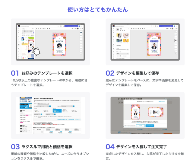 ラクスルの印刷プラットフォームからAdobe Expressを直接起動し、作成したデザインデータをラクスルの印刷プラットフォームにそのまま入稿できるので業務効率が向上する。Adobe Expressのブランド管理機能や豊富なテンプレートを活用して統一感のあるデザイン名刺を作成したり、チラシやポスターのデザインをSNS用画像やWebバナー向けにカスタマイズしてクロスメディア展開したりすることが簡単にできる。