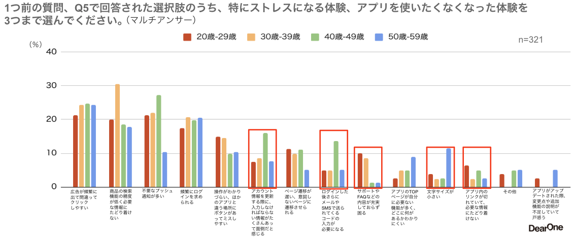 さらに、年代別に「利用時のストレス内容」を聞くと、20~30代では「サポート体制」、40代では「アカウント情報更新時の情報入力」「ログイン後の認証」、50代では「文字サイズが小さい」などが挙がった。