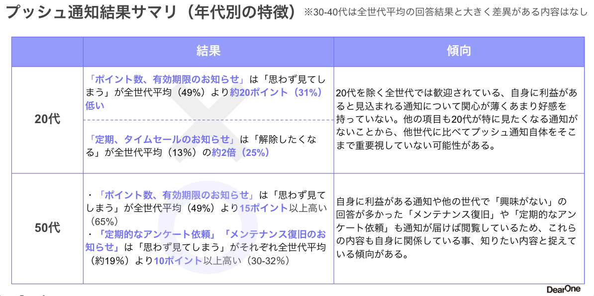 年代別に「プッシュ通知」に関する意見も聞いた。全年代の傾向として「ユーザー自身に利益がある、知りたい内容」は見るが、それ以外の「アプリ提供者都合の通知」は興味がなく、解除したくなるという傾向に。