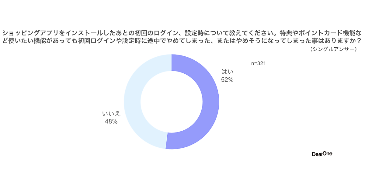 ショッピングアプリ利用者の52%が初回ログイン、設定時に操作をやめてしまいそうになるネガティブな体験をしていた。メリットがある一方で、初期段階で離脱するほどの強いストレスを半数以上が感じている。