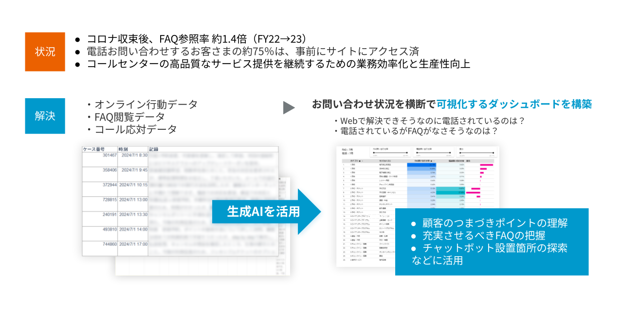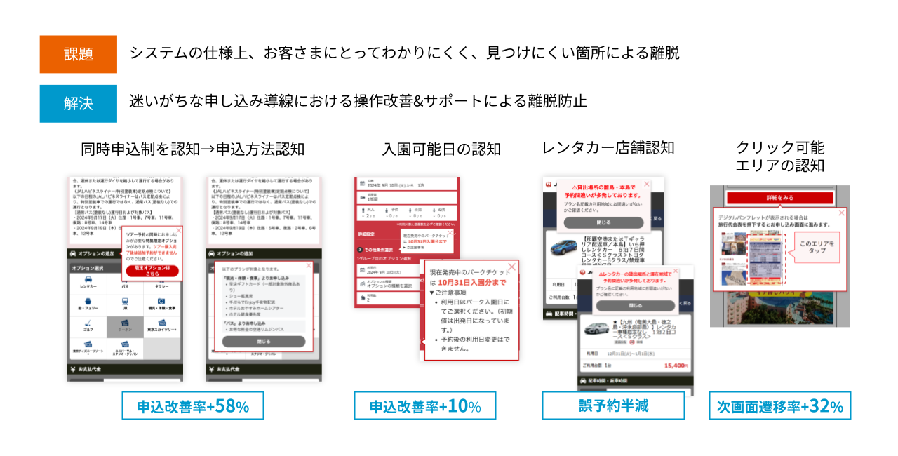 国内・海外ツアー領域では、東京ディズニーリゾートのツアー商品で未発売日程の検索エラーで問い合わせが増加していたが、旅行出発日やホテルなど条件指定箇所で発売日情報を表示して検索エラーを低減した。航空券予約領域では、サイト上での顧客行動分析に注力し、コンタクトセンターの入電状況やアンケート調査の声を生成AI(人工知能)で分析してヒートマップで可視化。N1分析手法で顧客のつまずきポイントを特定している。