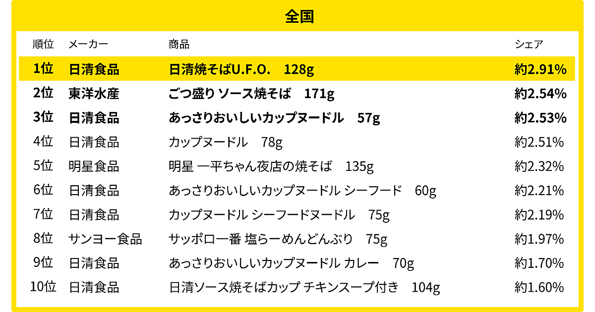 全国ランキングの1位は「日清焼そばU.F.O(日清食品)」だった。2位は「ごつ盛り ソース焼そば(東洋水産)」、3位は「あっさりおいしいカップヌードル(日清食品)」と続いた。カップ麺のジャンルでは10位まで「焼きそば」と「ラーメン」が占める結果となった。