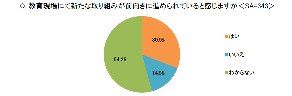 「新たな教育の取り組み」に対し「前向きに進められている」と評価した人は30.9%に留まり、「わからない」が54.2%と過半数を占める結果になった。