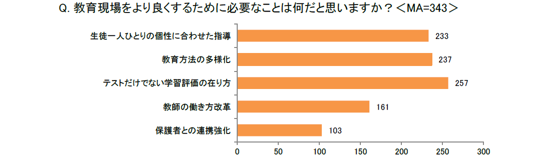 「教育現場をより良くするために必要なこと」を聞くと、「テストだけでない学習評価の在り方」が約7割(257)と最も多く挙げられ、次いで「教育方法の多様化」(237)や「生徒一人ひとりの個性に合わせた指導」(233)と続いた。生徒の多様な学び方を尊重し、一律の評価基準に捉われない柔軟な教育を求めている親が多いことが伺える調査結果となった。