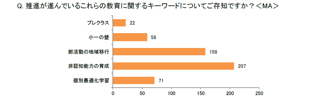 「推進が進んでいるこれらの教育に関するキーワード」を聞くと、「非認知能力の育成」(207)が最も多く挙げられ、次いで「部活動の地域移行」(158)となった。