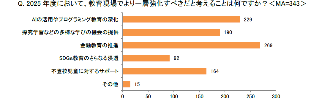 「2025年度において、教育現場でより一層強化すべきこと」を聞くと、「金融教育の推進」約8割(269)が最も多く、次いで「AIの活用やプログラミング教育の深化」(229)が続いた。