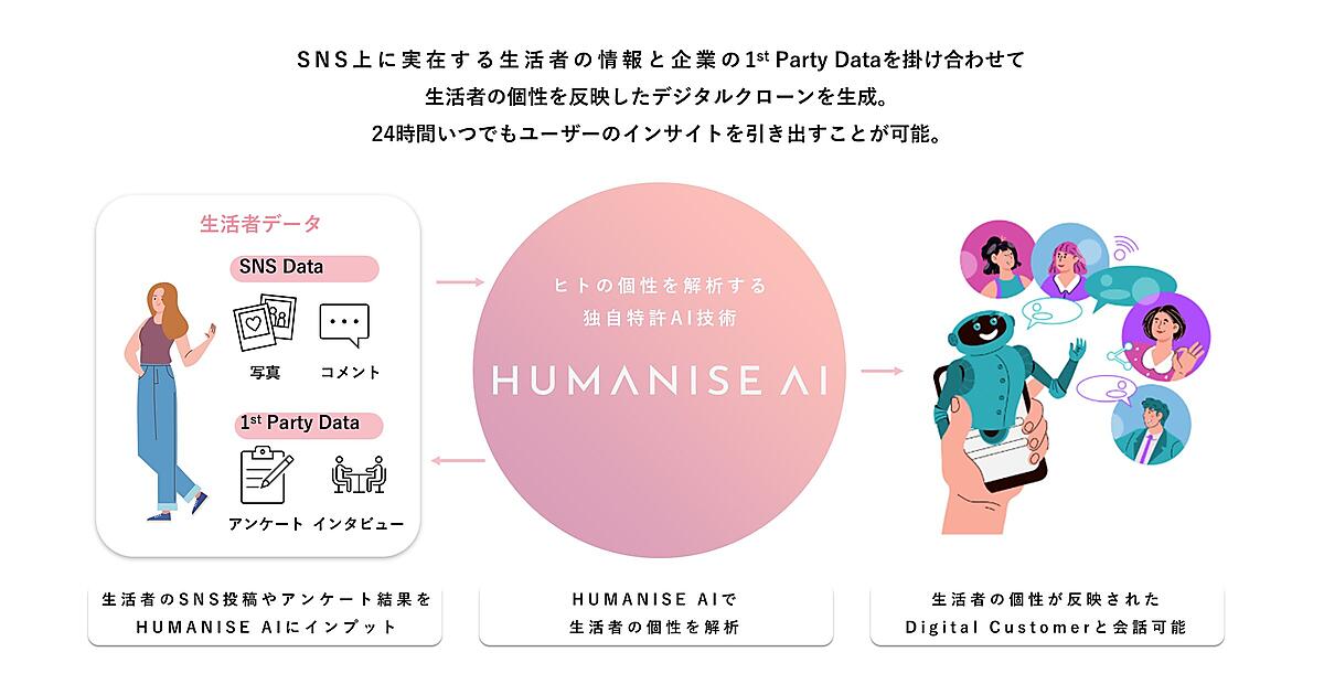 HUMANISE AIは、SNSのデータから個人の特性、興味、ライフスタイルなどの個性をプロファイリングデータとして抽出し、それを基にデジタルクローンを生成する。今回は、SNSに実在する消費者情報と企業のデータから人のインサイトを可視化して個性のあるAIを生成するオンライン消費者調査ツール「デジタルカスタマー」を活用。消費者のインサイトがいつでも引き出せる。