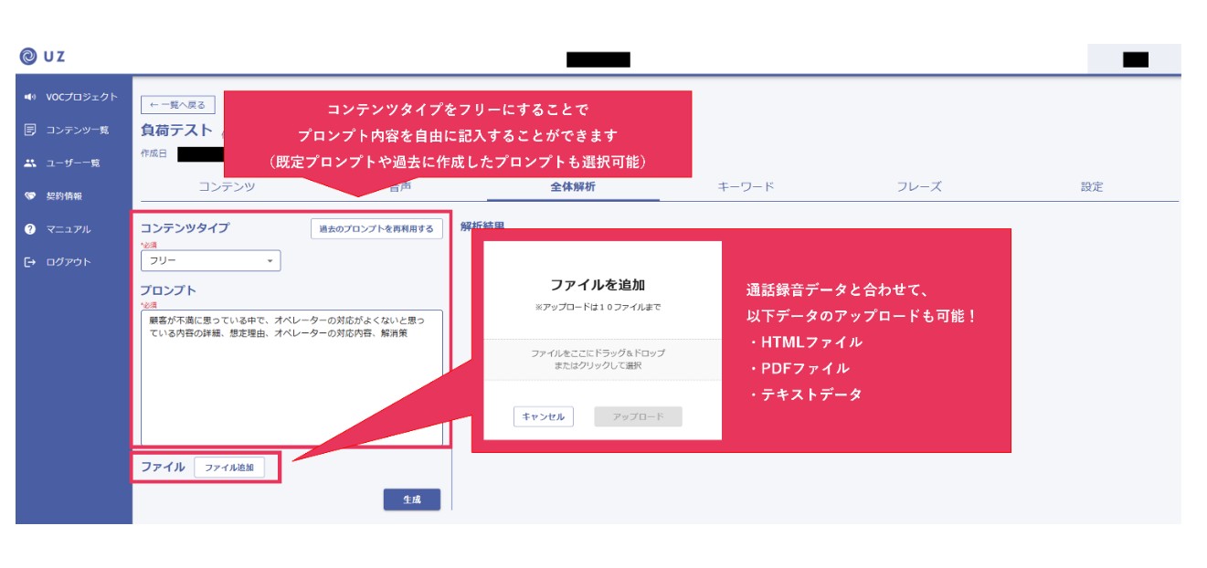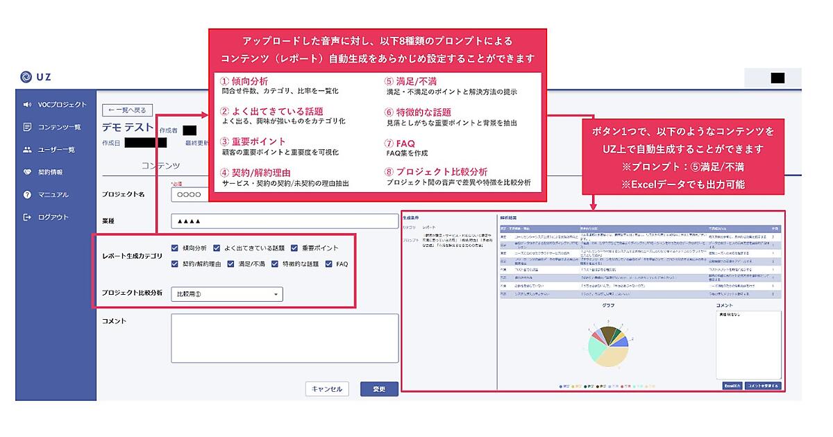 UZは、コールセンターの通話録音データから興味・関心キーワードを独自開発のAIエンジンで自動抽出し、それを基に生成AIで広告テキスト、メルマガ、トークスクリプト(顧客との会話内容や流れをまとめたマニュアル)などを生成することでVOC分析やマーケティングに生かすシステム。今回のバージョンアップで具体的な活用案や改善策を導き出す機能を拡充した。