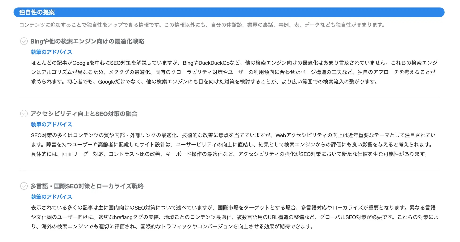 そのため、AIの網羅性と人間による独自性を融合した記事生成を支援する仕様にした。パスカルが持つ上位ページの統計データに基づいて網羅性が高い記事タイトル案と構成案をAIが出力。AIは、コンテンツに加えると独自性が高まる情報を提案し、ユーザーの満足度向上と差別化が可能な切り口を提示。これを参考にして独自性のある記事が書ける。