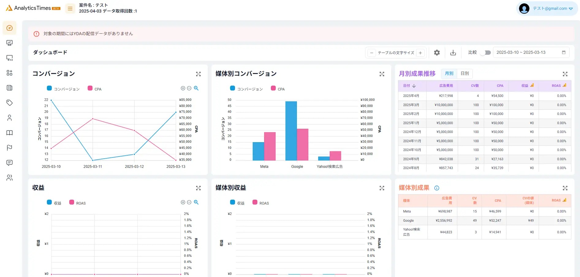 デジタル広告の運用代行やGoogleのウェブ測定ツール「Googleアナリティクス」の解析などを行うRadical Ad(ラディカルアド)は、広告データを容易に統合・可視化する統合データ分析プラットフォーム「Analytics Times(アナリティクスタイムズ)」のβ版提供を始めた、と4月4日発表した。広告媒体のデータとGoogleアナリティクス4(GA4)のデータを1画面で示す。