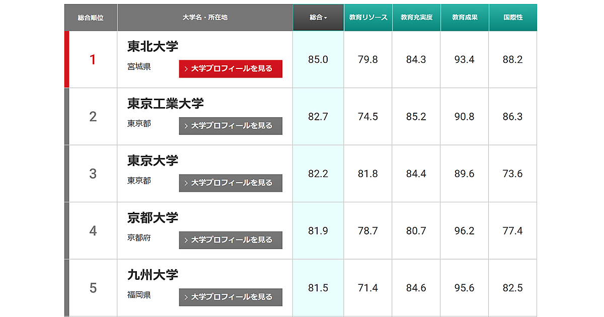 5年連続の1位に輝いたのは「東北大学」。教育リソース、教育充実度、教育成果、国際性の全てで高い評価を得た。2位は前回から2つ順位を上げた「東京工業大学」、3位は「東京大学」、4位は「京都大学」、5位は「九州大学」がランクイン。なお、東京工業大学と東京医科歯科大学は、2024年10月に東京科学大学として統合したが、今回は別の大学としてエントリーしている。