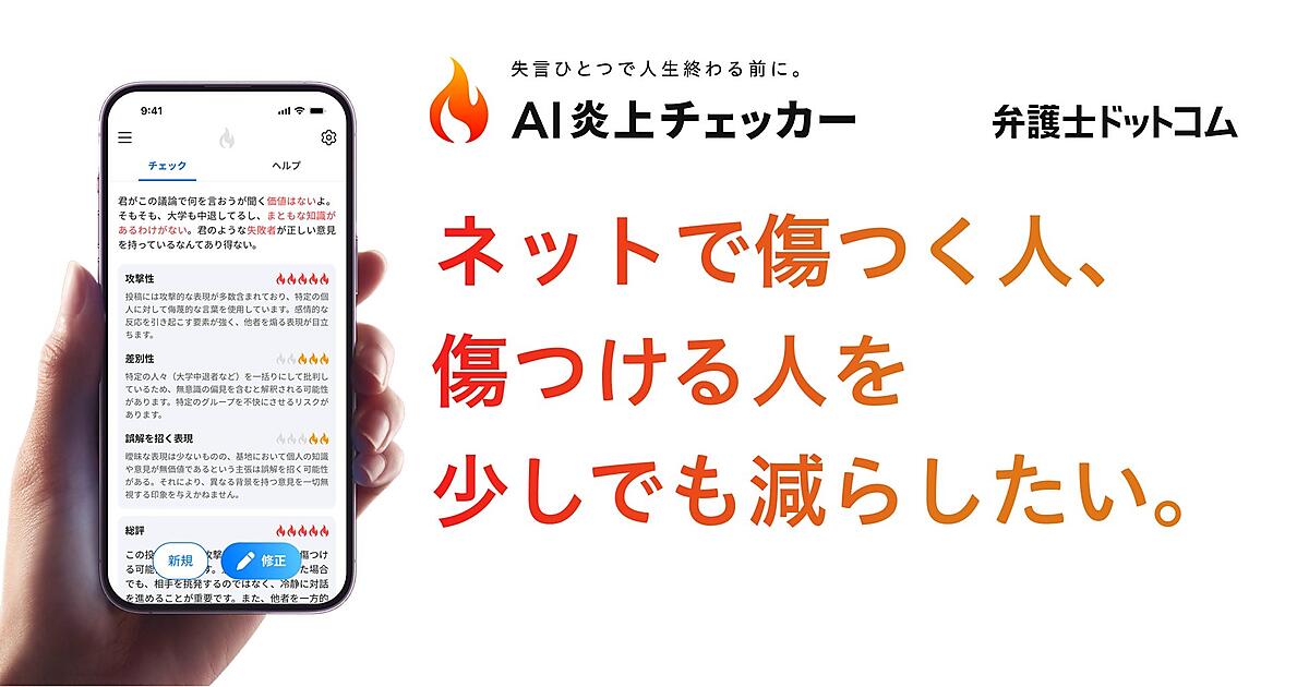法律相談サイトや契約プラットフォーム事業の弁護士ドットコムは、SNS上での炎上や誹謗中傷を生成AI(人工知能)を活用して未然に防ぐリスクチェックツール「AI 炎上チェッカー」を4月7日に発表した。インターネットサービスに投稿する前に投稿内容の誹謗中傷性や炎上リスクをチェックできる。クローズドβテストの参加者をインフルエンサーや企業広報、法務部門、メディア運営者、広告代理店などを対象に4月18日まで募集する。