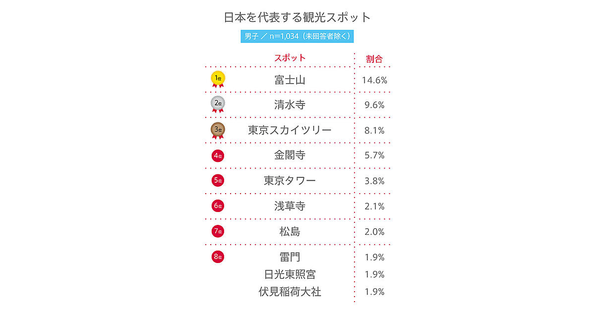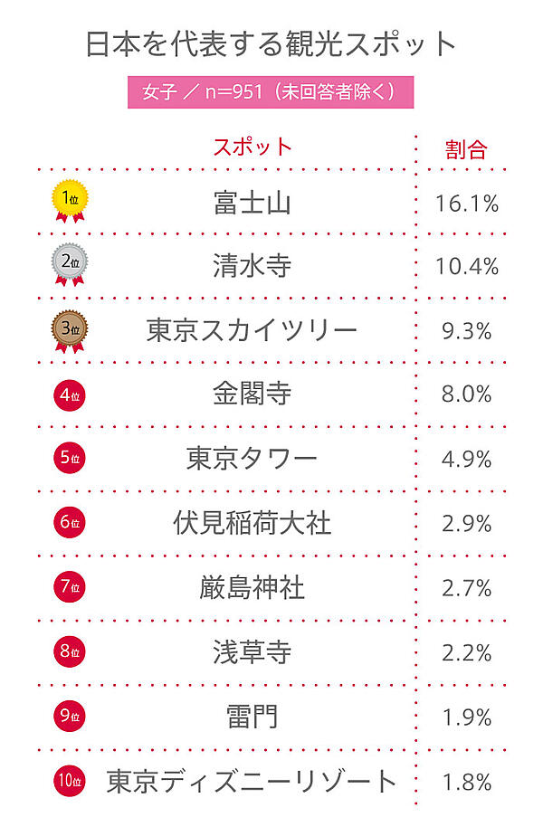 男子1,430人、女子1,254人に「日本を代表する観光スポット」を聞いた結果、男女ともに1位は「富士山」があがった。日本一高い山として有名なだけでなく、独自の信仰対象にもなっており、2013年にはユネスコ世界文化遺産に登録。男子14.6%、女子16.1%と高校生からも高い支持を受けた。