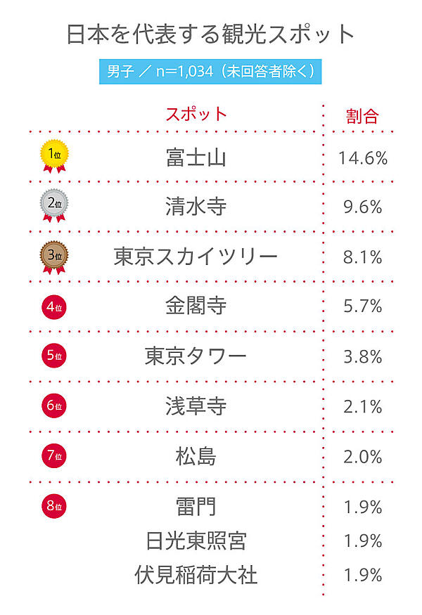 2位以下には、「清水寺」「東京スカイツリー」「金閣寺」「東京タワー」が続き、これも男女ともにまったくの同順。歴史ある宗教建築と、日本最高度の建築物が人気を分け合っている。