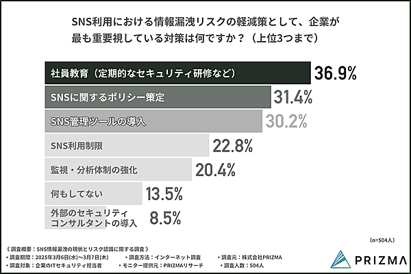 一方「SNS利用における情報漏えいリスクの軽減策として、企業がもっとも重要視している対策」について聞くと、「社員教育(定期的なセキュリティ研修など)」36.9%が最多で、「SNSに関するポリシー策定」31.4%、「SNS管理ツールの導入」30.2%が続く。