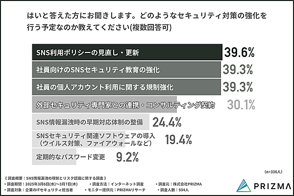さらに「セキュリティ対策の強化を行う予定がある」とした企業にその内容を聞くと、「SNS利用ポリシーの見直し・更新」39.6%が最多で、「社員向けのSNSセキュリティ教育の強化」39.3%、「社員の個人アカウント利用に関する規制強化」39.3%が上位だった。企業はシステムによる技術的な管理より従業員の意識に頼っている様子がうかがえる。