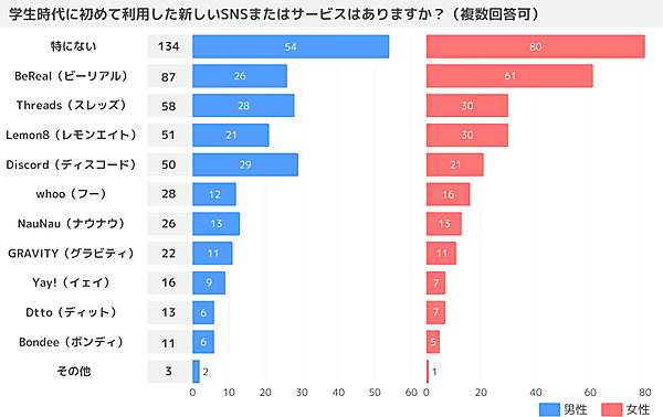 まず「学生時代に初めて利用した新しいSNSまたはサービス」(複数可)を聞くと、「BeReal」「Threads」「Lemon8」「Discord」が上位だった。リアルタイム性が強く特定の興味・コミュニティに特化したSNSの台頭がうかがえる。男女別では、女性は「BeReal」、男性は「Discord」の利用率が高かった。