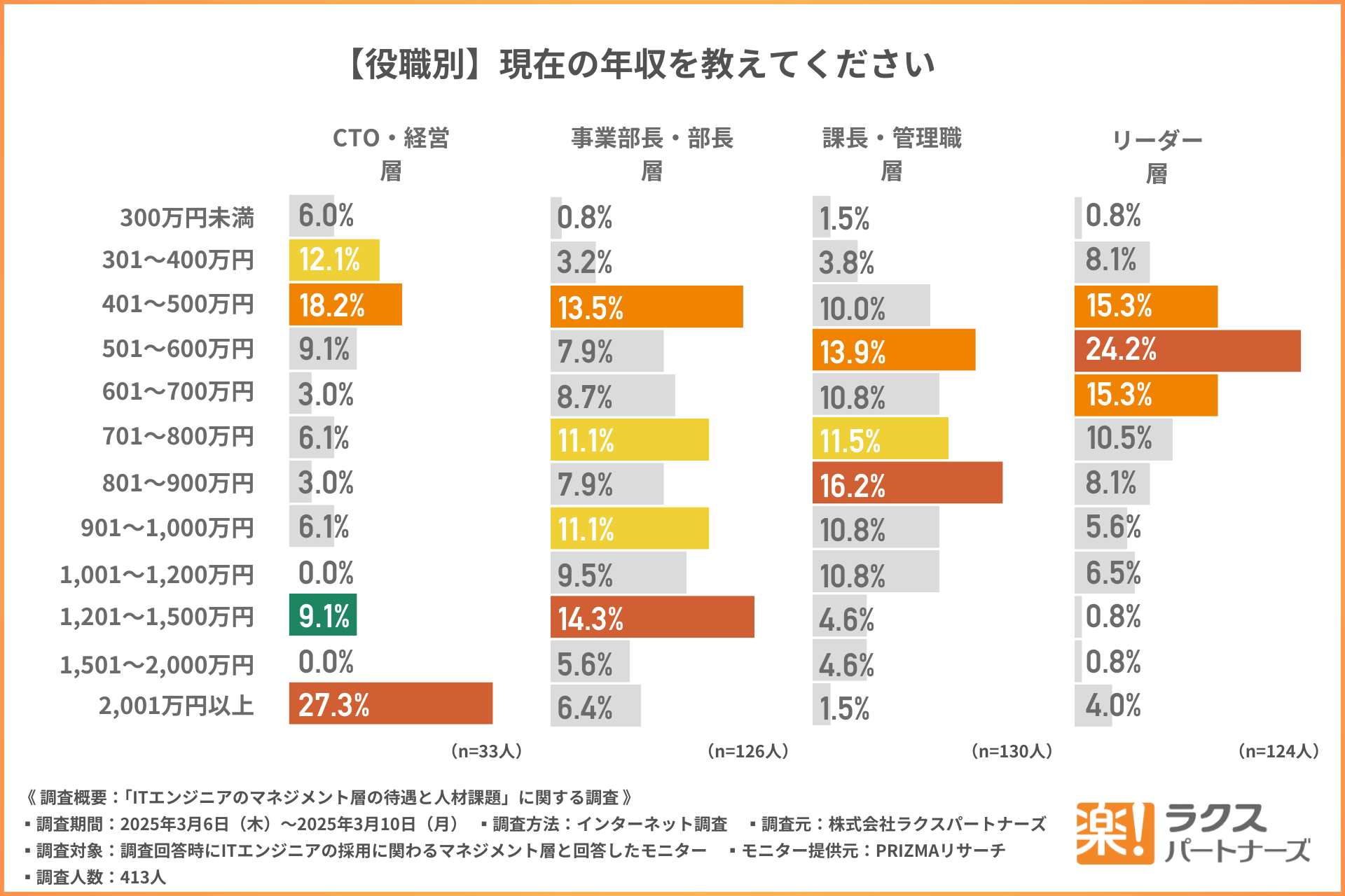 役職別でみると、リーダー~課長のミドルマネジメント層は501~900万円が厚い。また役職が上がるほど当然に高年収だが、CTO・経営層ではばらつきが目立つ。