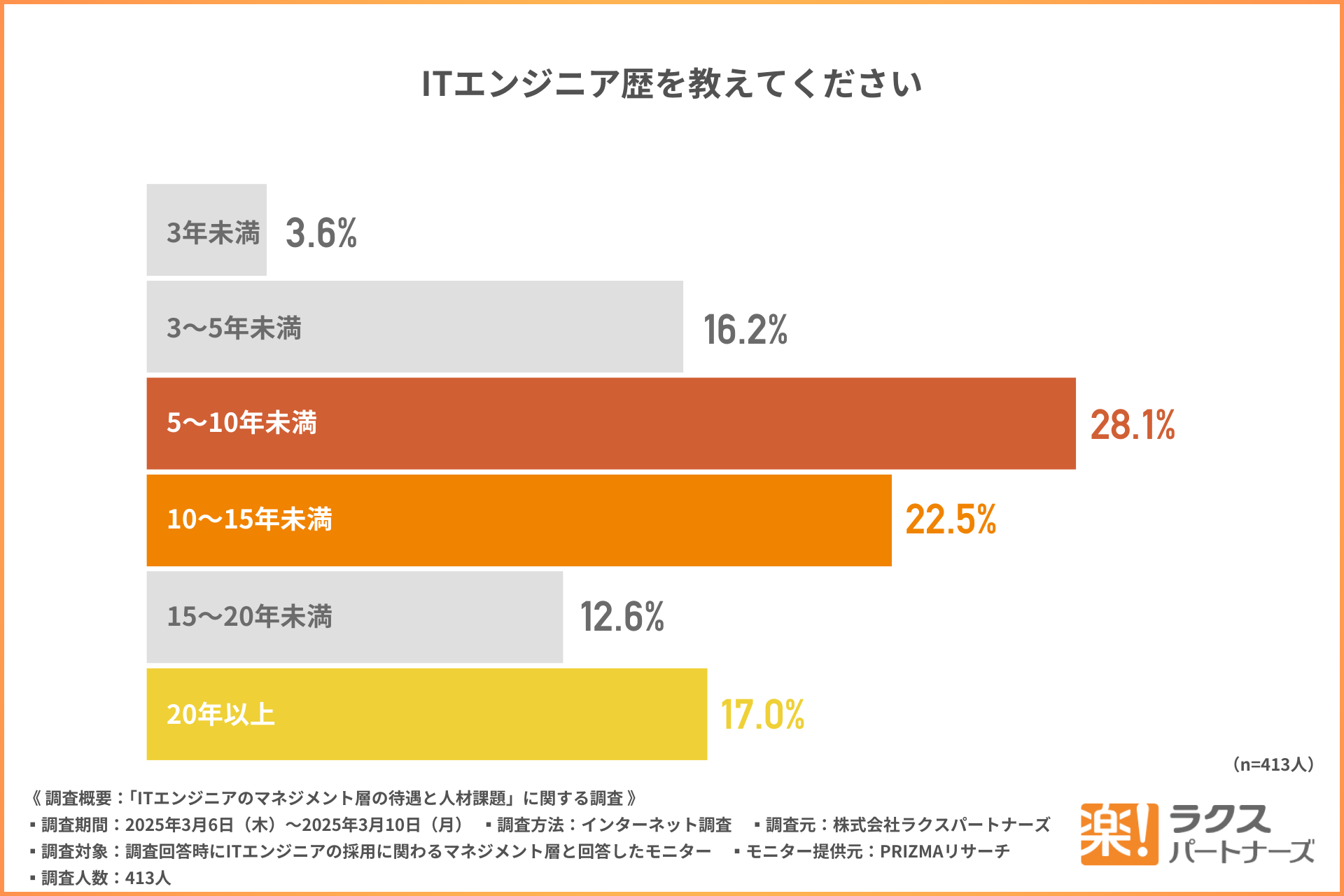 次に「ITエンジニア歴」を聞くと、「5~10年未満」28.1%が最多。以下「10~15年未満」22.5%、「20年以上」17.0%が続き、約8割が5年以上の経験を持っていた。