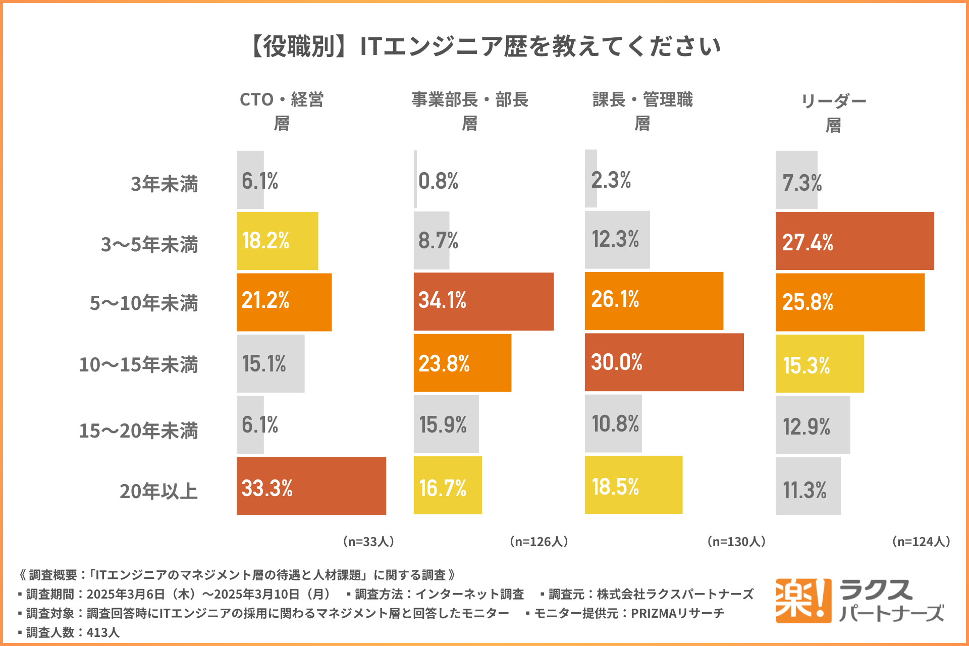 役職別で見ると、管理職以上の過半数がITエンジニア歴10年以上だったが、比較的浅い経験で管理職に就いている人も存在した。リーダーシップやマネジメント能力などが評価されたと考えられる。