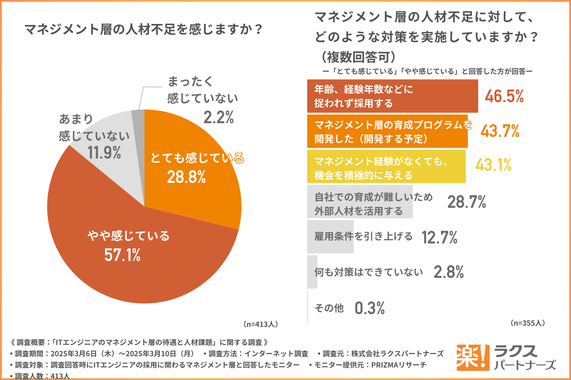 ラクスパートナーズは、「ITエンジニアのマネジメント層の待遇と人材課題」に関する調査結果を発表した。ITエンジニアの採用に関わるマネジメント層(リーダー・課長・部長/事業部長・CTO)413人が回答している。