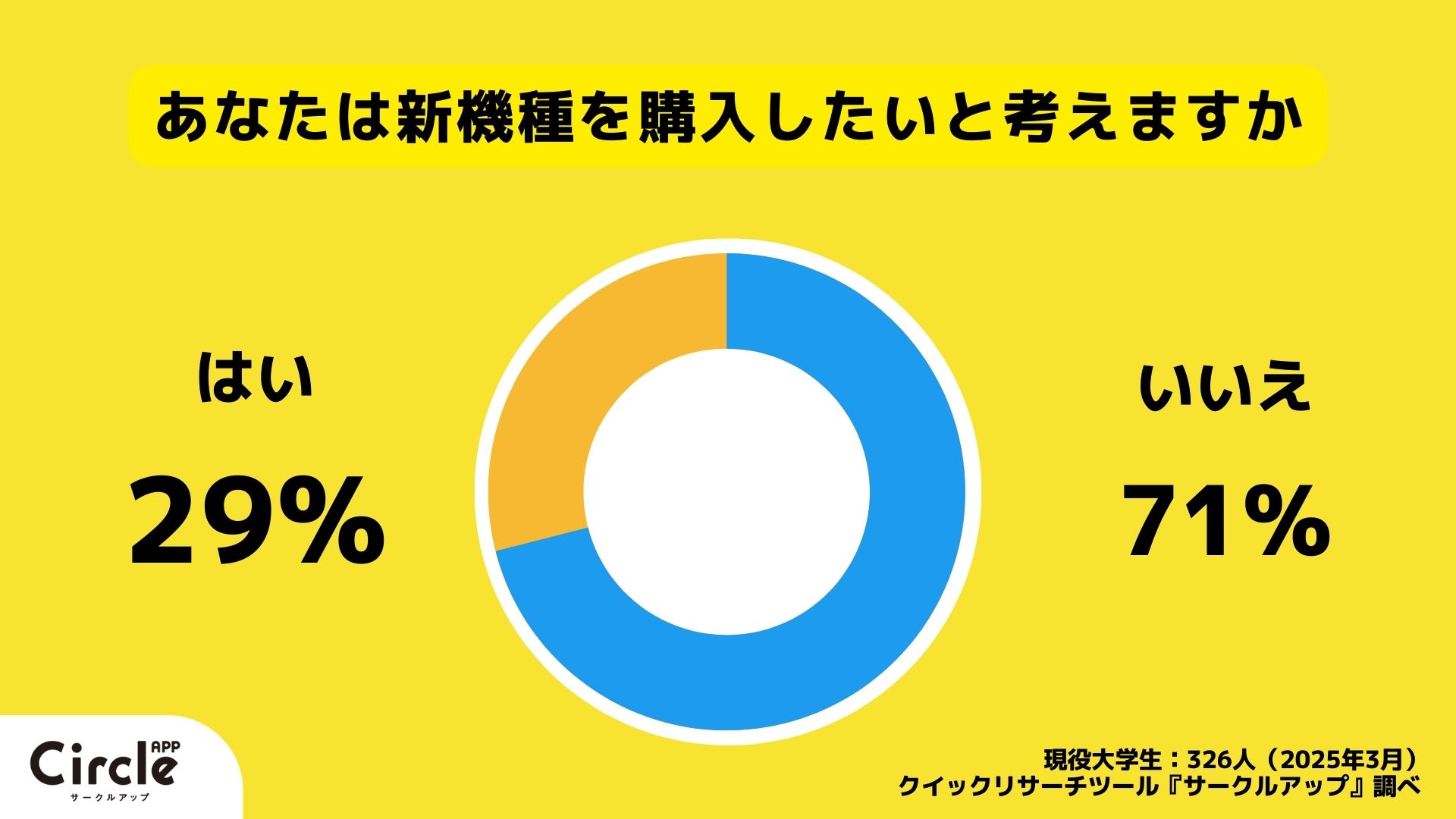 一方で最新機種である「iPhone 16e」(2025年2月28日発売)について購入したいかを聞くと、「いいえ」が71%と多数派。
