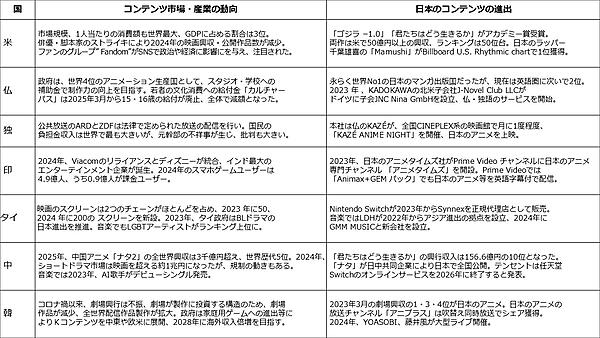 世界7か国のコンテンツ市場の動向としては、米ハリウッドにおけるストライキの影響、フランスにおけるカルチャーパス給付金の一部廃止、インドにおける巨大エンタメ企業の誕生、タイにおけるBLドラマの日本進出推進などのトピックが触れられている。また日本コンテンツの進出では、「ゴジラ-1.0」「君たちはどう生きるか」のアカデミー賞受賞、韓国でのYOASOBI・藤井風らの大型ライブ開催などが言及されている。