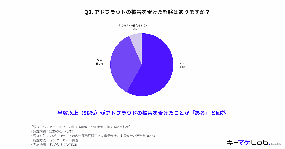 キーワードマーケティングが展開するメディア「キーマケLab」は、アドフラウド※に関する理解・被害実態に関する調査を実施した。1年以上の広告運用経験がある担当者300名を対象に調査している。