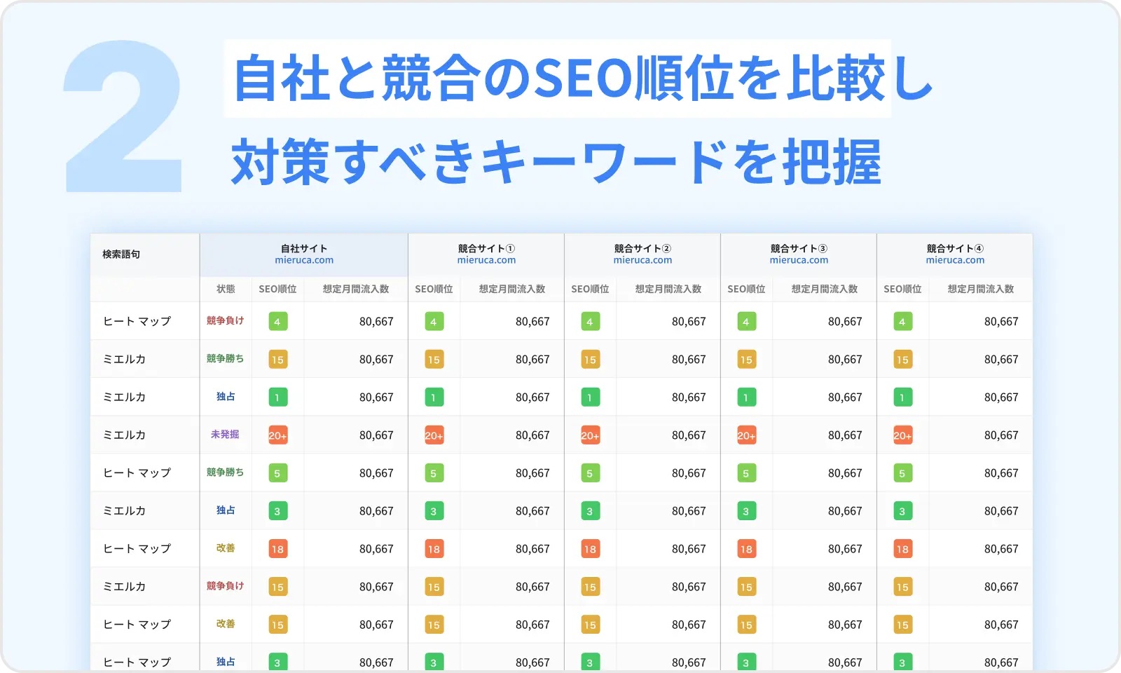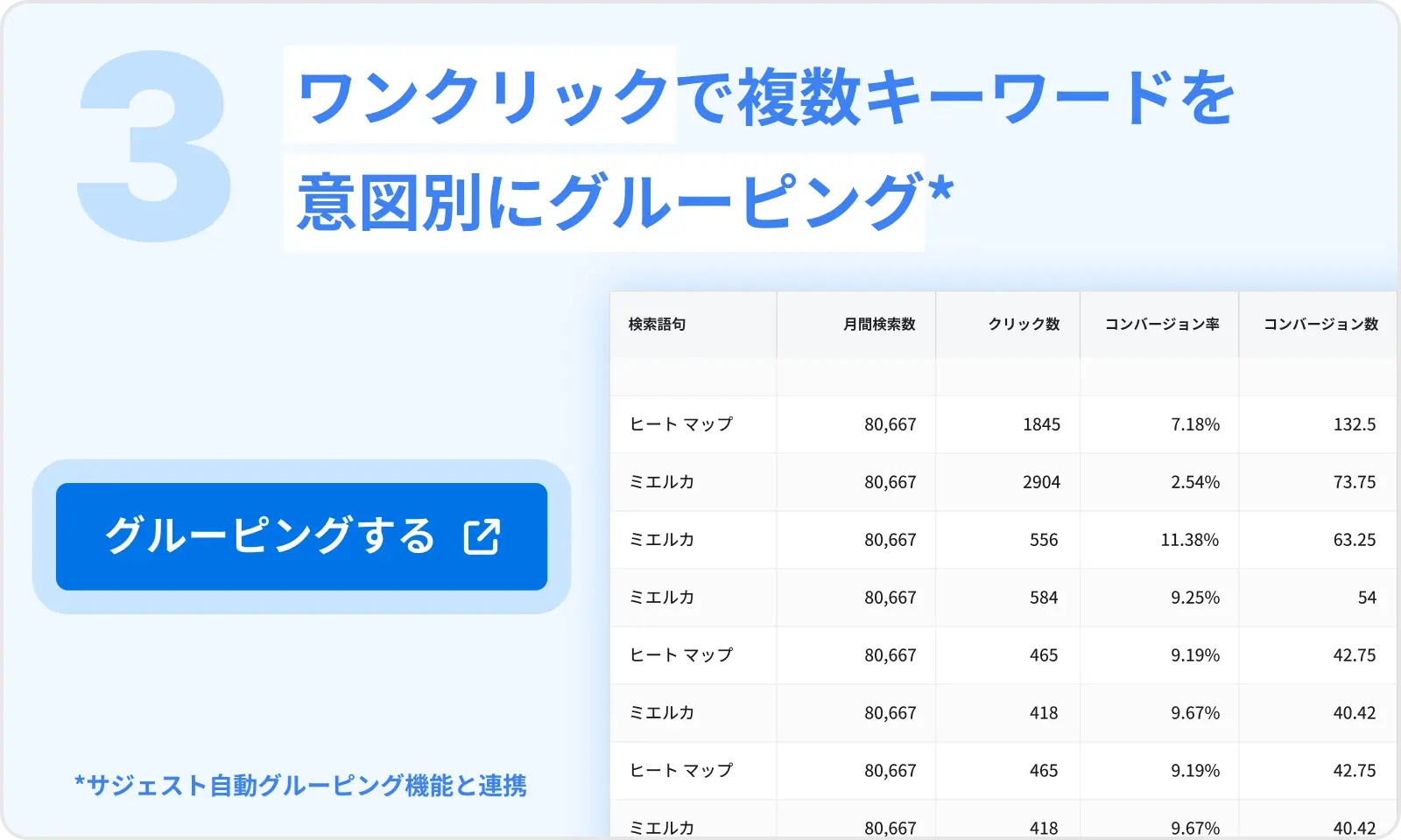 Google広告で実際にコンバージョンを生み出したキーワード▽各キーワードの自然検索での検索順位▽各キーワードの自然検索での想定月間流入数▽競合サイトとの検索順位比較▽各キーワードの月間検索ボリューム--が分かる。従来機能「サジェスト自動グルーピング機能」との連携で複数キーワードを意図ごとに自動分類することも可能。