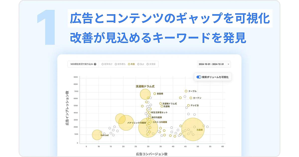 検索連動型広告(リスティング広告)はユーザーが検索エンジンにキーワードを入力して情報を探す点で自然検索と共通する部分が多く、コンバージョンにつながったリスティング広告のキーワードを自然検索に活用することで、ユーザーの集客を図る。広告コンバージョンKW機能によって、SEO施策に利用できるさまざまなデータが確認できる。