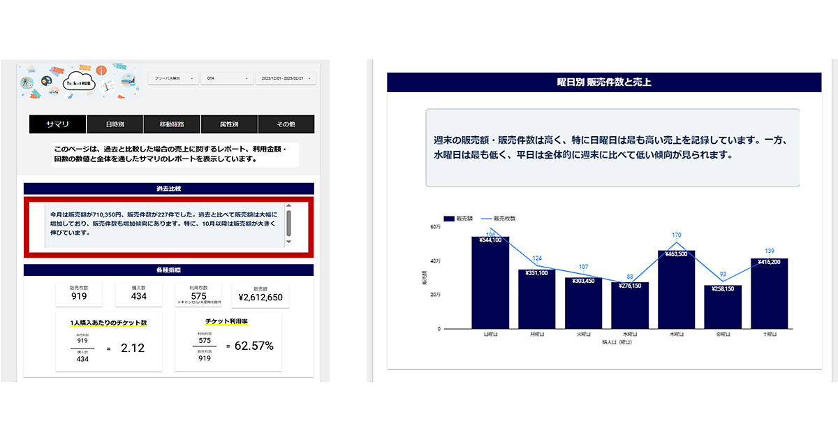 活用例として、スタンプラリーや電子チケットの利用実績からの域内周遊ルートの分析▽各種予約・販売データの売り上げや過去の実績との比較▽複数の予約情報や利用実績データから旅行者のペルソナ(典型像)--のレポートなどを挙げている。JTBとKIYONOは機能拡充や新ソリューションの開発を進め、自治体や地域事業者の観光DXの実現を支援する。