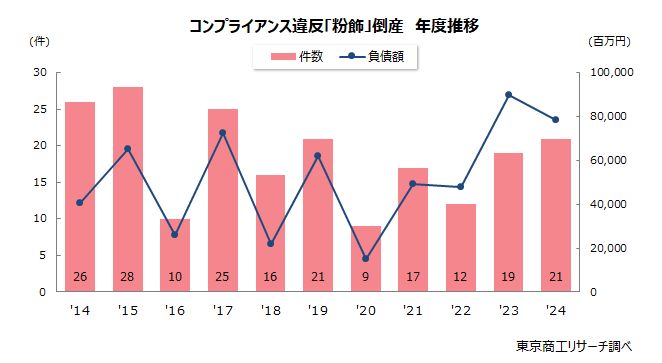 このうち「粉飾決算」に起因する倒産は21件(前年度比10.5%増)で、コロナ禍の2020年度は9件まで減少したが、2024年度は2020年度比で2.3倍増となった。借入金の返済猶予などの支援要請で粉飾が発覚するケースが目立ったとのこと。